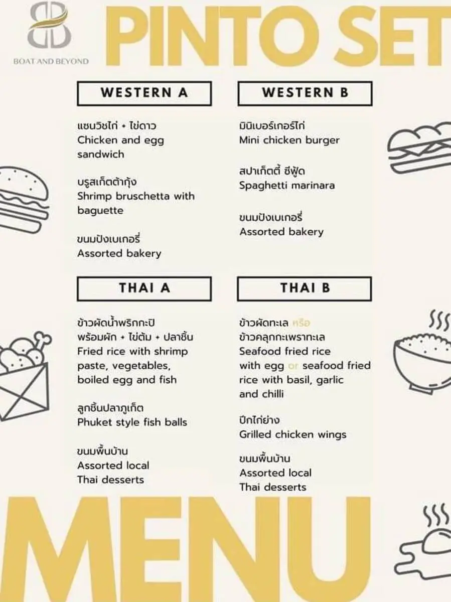 ทางเรือจะมี Set เมนูอาหารให้เลือก 4 อย่าง ทั้งอาหารไทยเมนูจัดจ้าน ขนมพื้นบ้าน และ อาหารแนวตะวันตก มินิเบอร์เกอร์ สปาเกตตี้ อ่ะเลือกสรรได้เลยในเซ็ตนี้